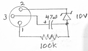 Here’s a 1N5240 10V zener diode hooked up with a 100K resistor and 47uF cap like a simple P48 mic. The noise is about equivalent to a ribbon mic’s output level. High frequency rolls off more than I had hoped for use as an ultra- wideband white noise generator. But it’s clear why zeners need to be filtered.