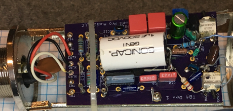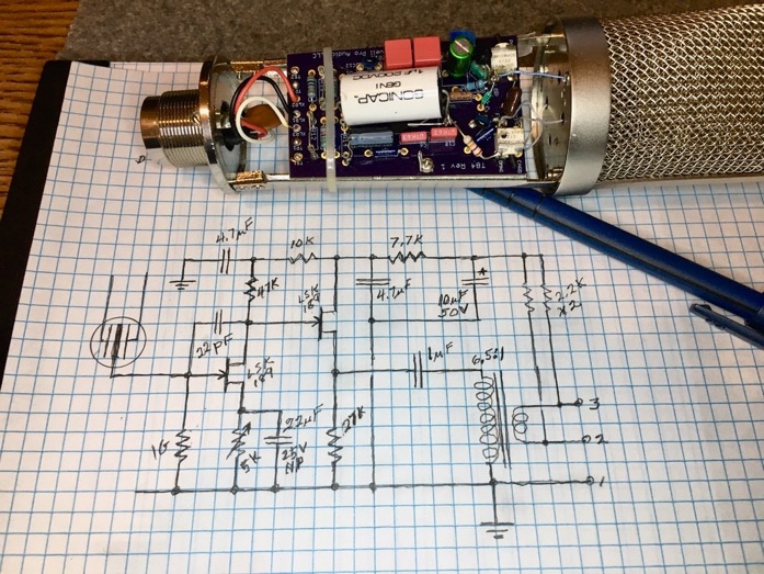 Is it worth the extra parts cost? To me, it is. It’s a cleaner, less compressed, more transparent KM-84 with an RK-47 large diameter capsule. It falls somewhere between the single FET ’84 and the op-amp mics, but with a bit of pure charge amp 2nd harmonic. Visible at the XLR plug in the photo, but not shown on the schematic are 0.001uF RF bypass caps. Combined with the transformer, RFI rejection is excellent, and since the capsule bias (again not shown on the digram) is taken directly from the 48V phantom supply like a normal KM-84, there is no internal oscillator noise. Ultrasonic hash is totally absent.