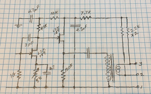 While working on the Weird Audio “Little Red Monster” tube mic, it occurred to me that the same idea of a common cathode input stage direct coupled to a cathode follower output stage with a transformer is easily done in solid state. Take a more or less standard KM-84 style circuit and tack on a source follower between the FET and the output capacitor, and voila! Only two additional parts, an FET, and a resistor.
