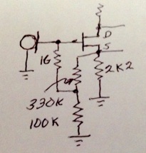 Alex used Scott Helmke’s “Alice” circuit with the addition of a pair of resistors to bias the FET gate and a Transound TSB2555B large diaphragm electret capsule.