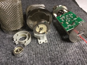 The starting point is a BM-700 or BM-800 cheap electret mic from eBay, Amazon, or wherever. This morning, prices run from $11 to $30+ apiece, so shop around. Update 2022: many of these cheap mics now have different circuit boards inside. Some are similar to these early ones, and some are stripped down and can’t be used for more than the metal body parts. See following blog entries.