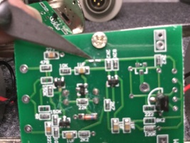 Soldering is required. If you aren’t experienced with a soldering iron, enlist a friend who is. The capacitors attach to existing pads on the printed circuit. The optional resistor requires cutting a trace and soldering. None of the parts are critical values, anything close from your parts stash should work. I used 22pF, 1000mF / 16V, and 330 ohms 1/4 watt.