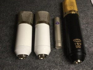 A finished pair of modified BM-800s next to a couple of more familiar mics.