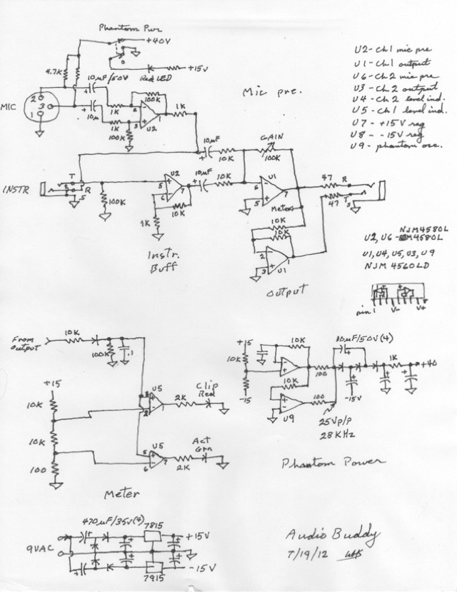 And that’s it - my Audio Buddy. I had assumed that phantom power was from a voltage multiplier on the incoming 9VAC, so why not substitute a 12V wall wart, other than extra heat from the 15V regulators? As it turns out, it wouldn't have had any effect. There's a lot of speculation online, but nobody had actually traced the circuit. It's a compromise. The circuit is cheap and simple and could be improved here and there. Obviously nobody is going to patch this in as a front end to a Neve console. It ain't dirty enough for lo-fi, it's slightly noisy, the gain is low for passive mics, and phantom power is iffy. Whatcha ‘spect for 50 bucks? It is what it is. The steel box is sturdy and well made, the connectors are solid, the knobs and pots look like they'd break if you hit them hard.
