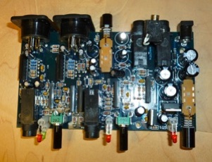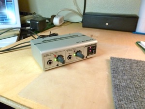 Among my handy gadgets is an Audio Buddy mic preamp. Useful for checking out mics, amplifying a signal via the instrument inputs, feeding the MacBook’s line inputs, etc. While cleaning some old Shure ribbon mics, I plugged them into the A.B. to check that they are still working. They sounded fine, which is a surprise since the listed mic input impedance is 1K ohms. That’s low for the Shures, which prefer something like 2.5K ohms. That set me wondering just what’s inside the box in detail. I had already opened it up and installed a mini stereo headphone jack for convenience when using it for signal tracing and patching into the laptop.