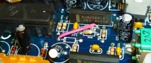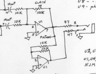 So no, the INSTR jack can’t be used as an insert point for the MIC. The inputs are mixed to a balanced line driver. Not much to see here. Variable gain zilch to 20dB. NJM4560L op-amp.