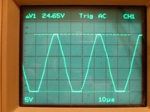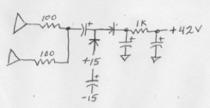 We have another 4560 used as an oscillator and parallel buffer generating a clipped sine wave rail to rail at about 27.5 KHz. This feeds a voltage doubler. Theory says 30V (-15 to +15) X 2 above the -15V rail = 45V, which is within the 48V ± 4V standard for phantom power. However...