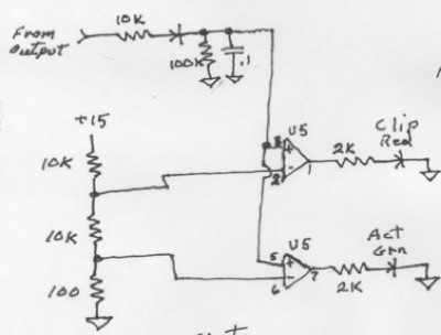 Metering is a couple of LEDs driven off the output thru a diode using another 4560 dual op-amp as comparators.
